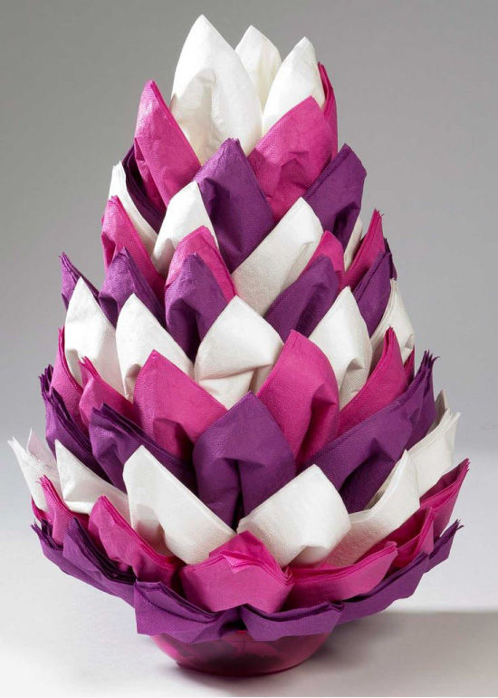 Ако подредите салфетките на няколко нива по схемата за правене на лотос, ще се получи красив конус. Този необичаен дизайн побира голям брой салфетки - от 50 до 100 броя.