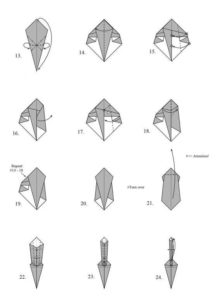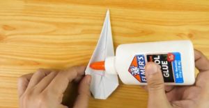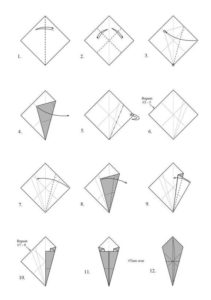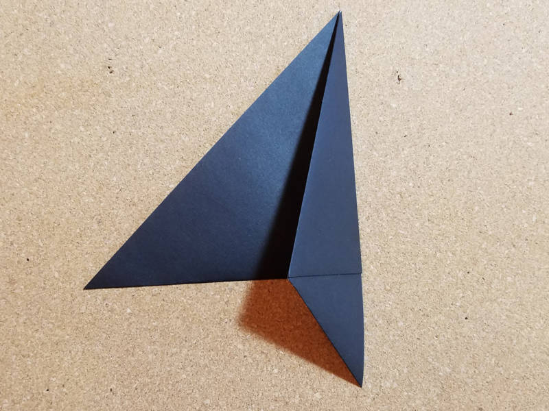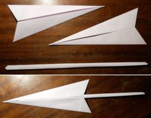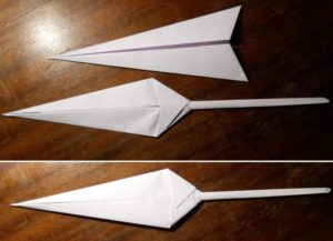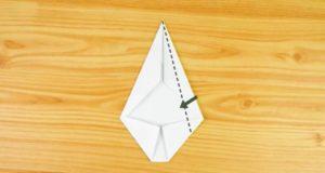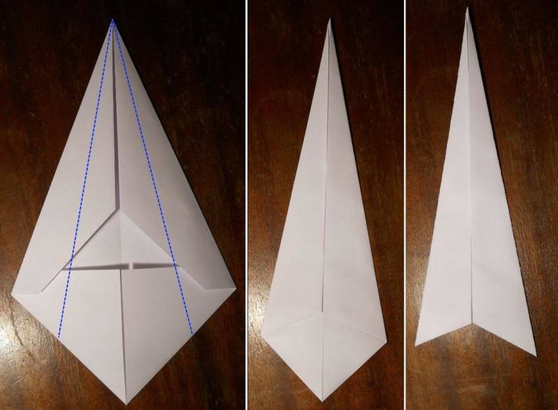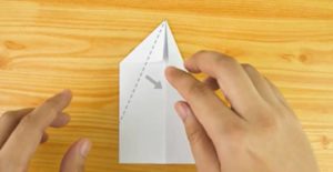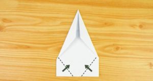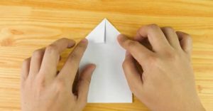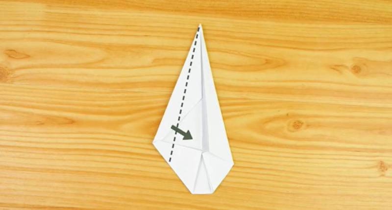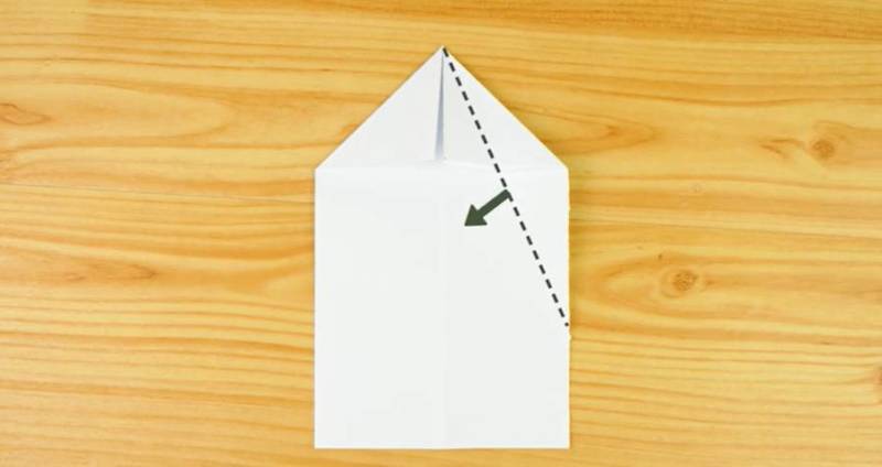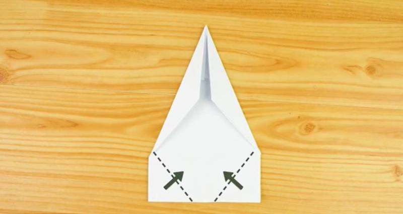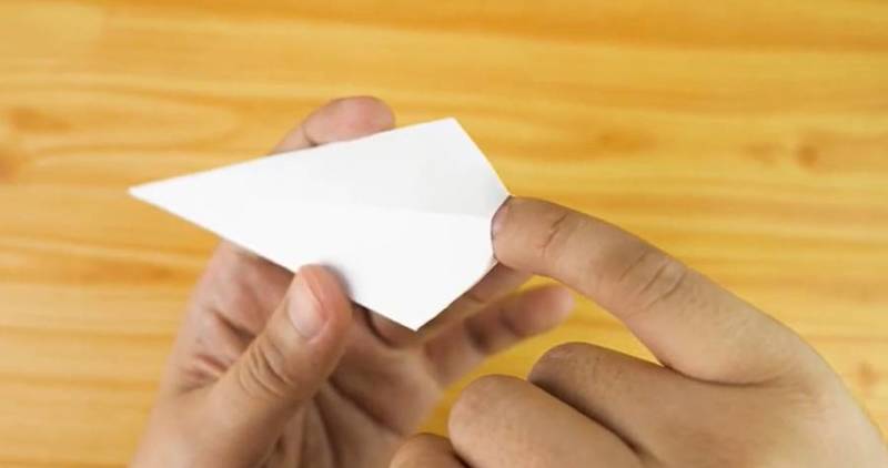 - Горните ъгли на хартиените фигури се огъват вътре в детайла, като по този начин се извършва първата стъпка в сгъването на лист хартия с техниката "самолет".