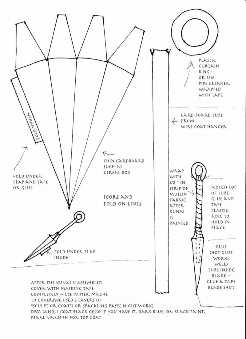 - Изработва се или се отпечатва специализиран шаблон за кунай. Може да бъде нарисуван върху дебел картон или хартия, най-важното е да се улесни прехвърлянето на чертежа върху основния материал.
