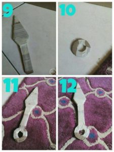 - Сглобете ги една по една с лепило за моливи или с лепило за PVA и ги закрепете върху дръжката на кунай. Резултатът е остро острие и красив етикет.