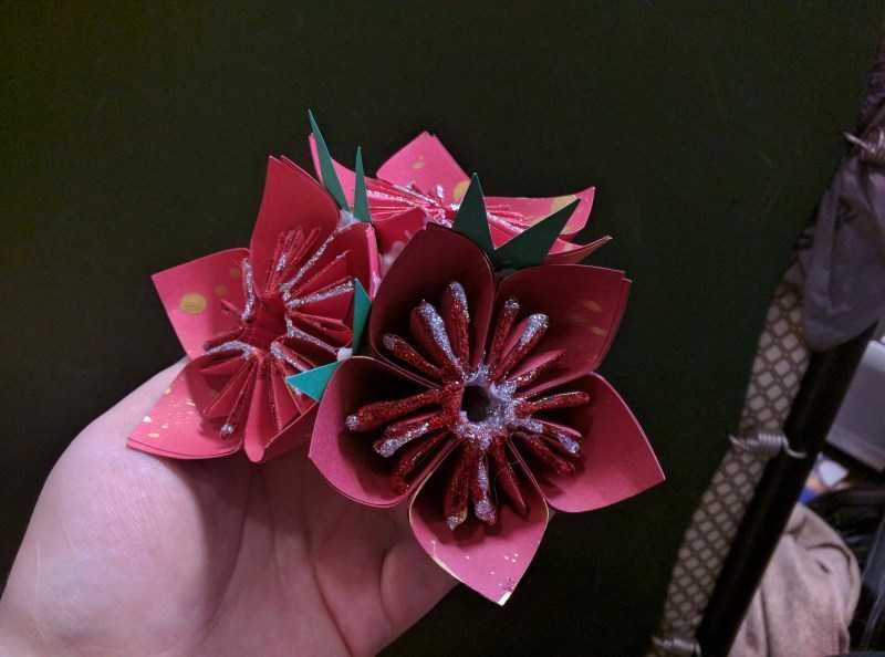 Красива аранжировка е, когато венчелистчетата са в два цвята. Например едната част е бяла, а другата - розова. Третата част за чашелистчетата е изработена от зелена хартия. Елементите се вкарват един в друг, като венчелистчетата на долната част се поставят между венчелистчетата на горната част.