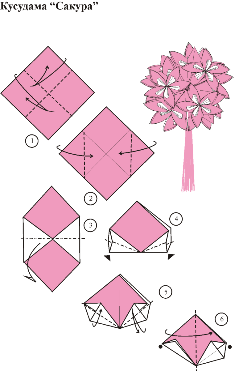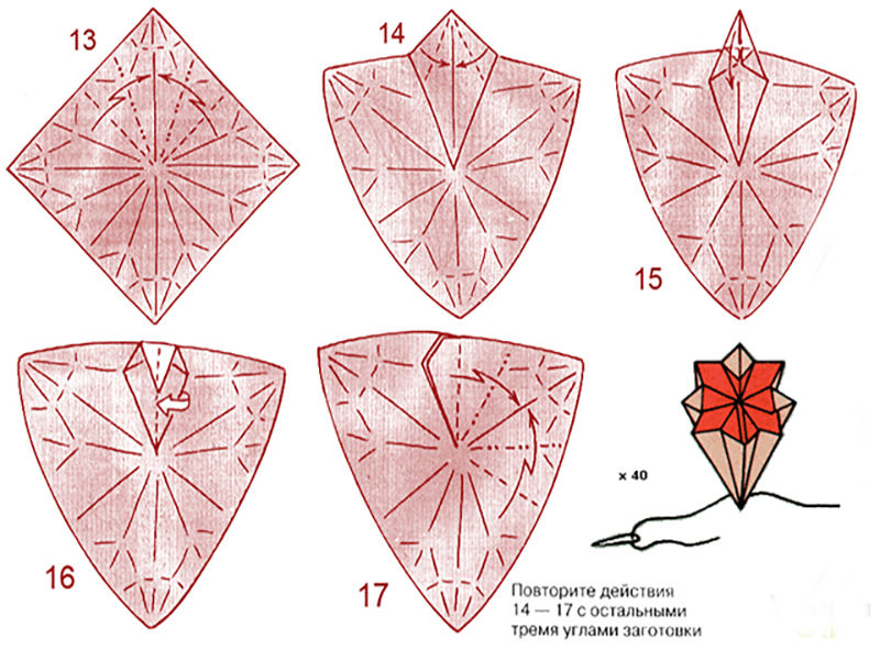 За топка от 12 цветя трябва да се сгънат 36 парчета според схемата. От зелена хартия изработете 12 чашелистчета, 12 бели и 12 розови листенца. За по-голяма естественост краищата на венчелистчетата са завити с молив.