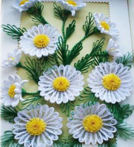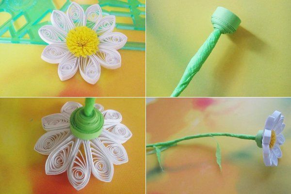 - За маргаритката използваме няколко модула под формата на капки - бели венчелистчета, а в средата - жълти, плътно усукани спираловидно.