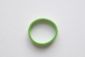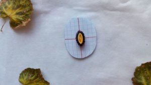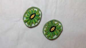 - Усучете панделка с различен цвят, разтворете я в шаблон с диаметър 9 мм, притиснете я, поставете я между двете половини, залепете частите.