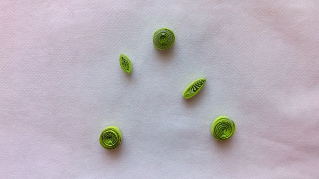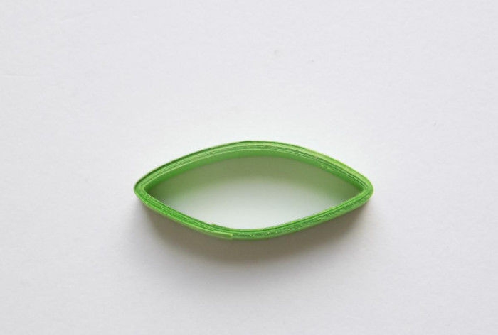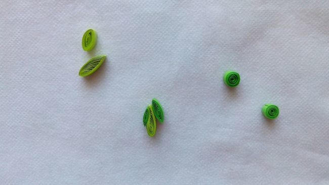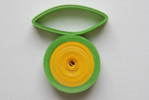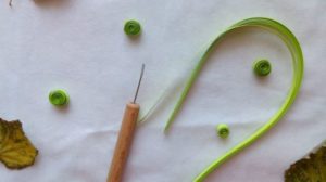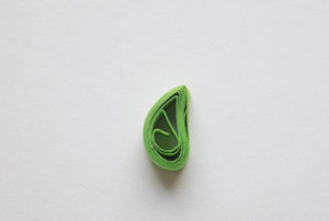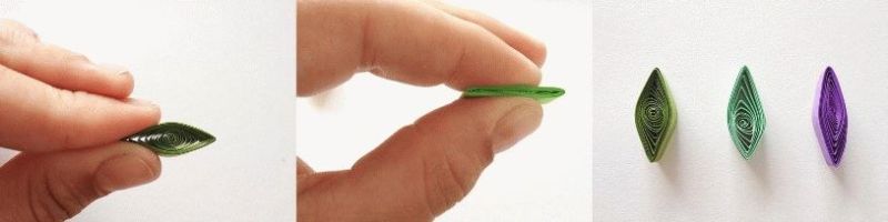 - Оформяме листата от зелените ленти на свободната спирала. Затегнете левия и десния край на спиралата, като създадете елемент на окото, десният край се издърпва надолу, а левият нагоре. Получихме извито листо. Такива трябва да1-3 броя.