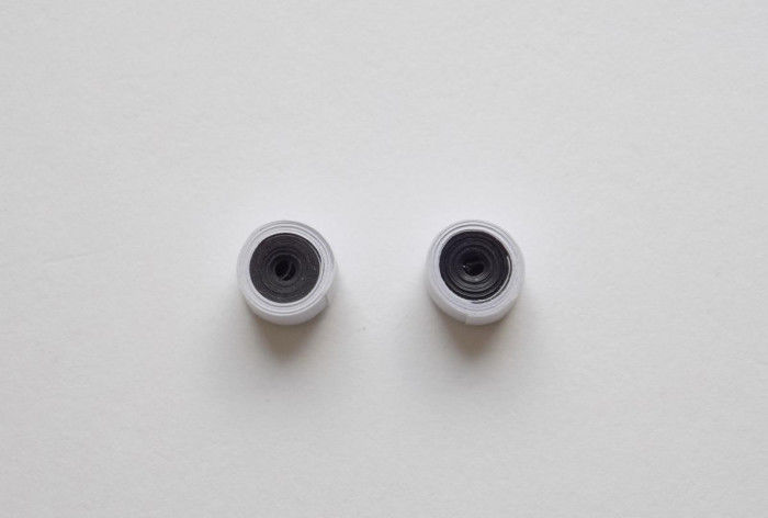 - Очите са изработени едновременно от половин черна и бяла лента. Получено око със зеница. Направете второ око.
