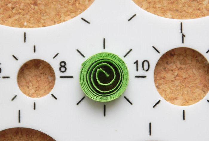 - Усложняване на работата. Разделете лентата наполовина. Направете две свободни спирали, разгънете шаблона до 13 мм, притиснете го, докато се получи полукръг.