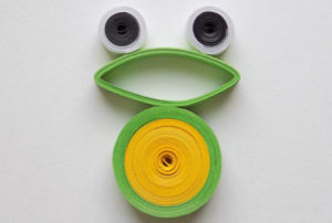 Увийте 3 жълти и 2 зелени ленти заедно и ги залепете с лепило, за да направите тялото на жабата: