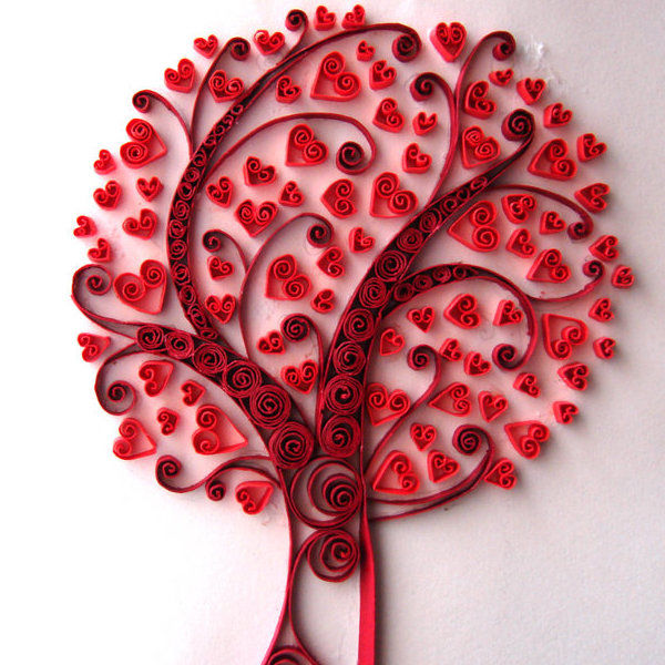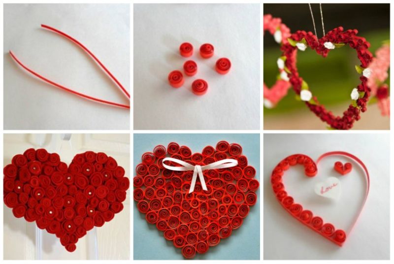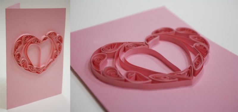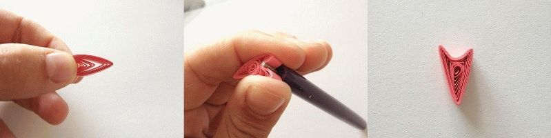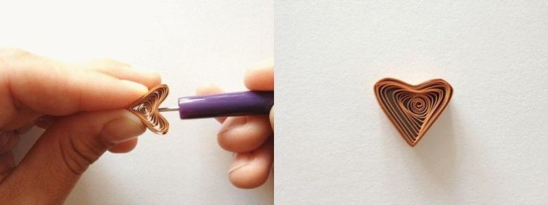 От кръгла свободна спирала натиснете единия край, размер 20 или 25, залепете върха. Свържете двете капки и ще получите сърце.