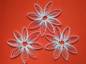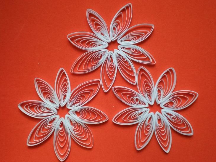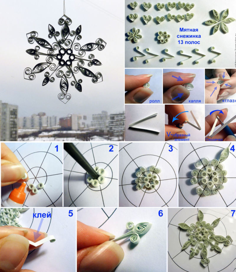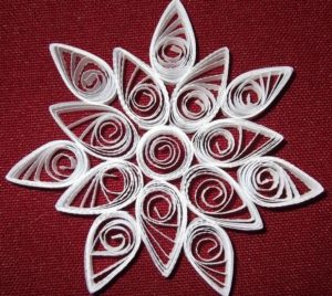 - Лесно е да се направи снежинка от усукани спирали с плътно усукана спирала в средата и 6-7 лъча в центъра.