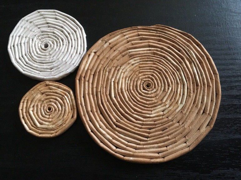 Можете да направите тъкането по различни начини. По-специално можете да поставите 20 тръби във вертикален ред и след това да редувате хоризонтални тръби за вестници. След това покрийте изделието с лепило PVA и го боядисайте в предпочитания от вас цвят.
