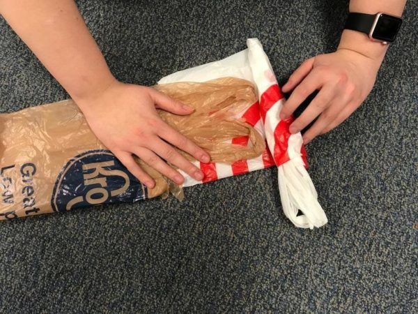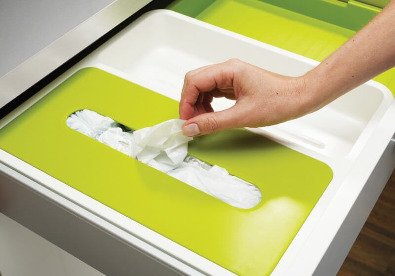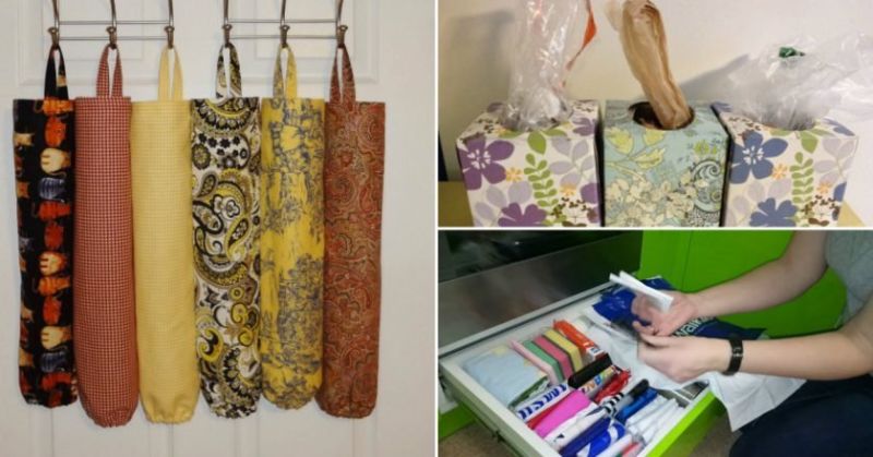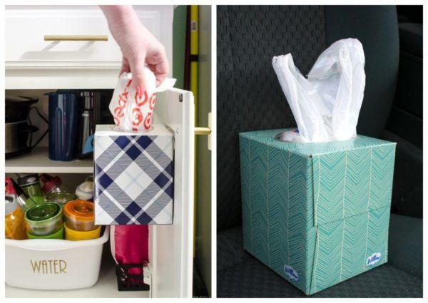 Гениален съвет за компактно съхранение на опаковките е да използвате поставка за салфетки. Редувайте се да изглаждате и подреждате торбите. След това я оформете на чиста ивица, равна на ширината на подготвения контейнер за салфетки.