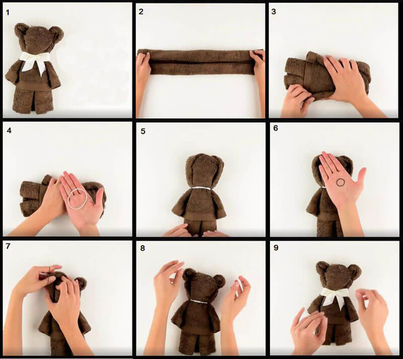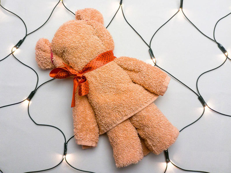 Достатъчно е да го сгънете във формата на смешно мече и подаръкът ще донесе голяма радост. Подходящ за направата на мека играчка е и стар халат за баня от хавлиена материя.