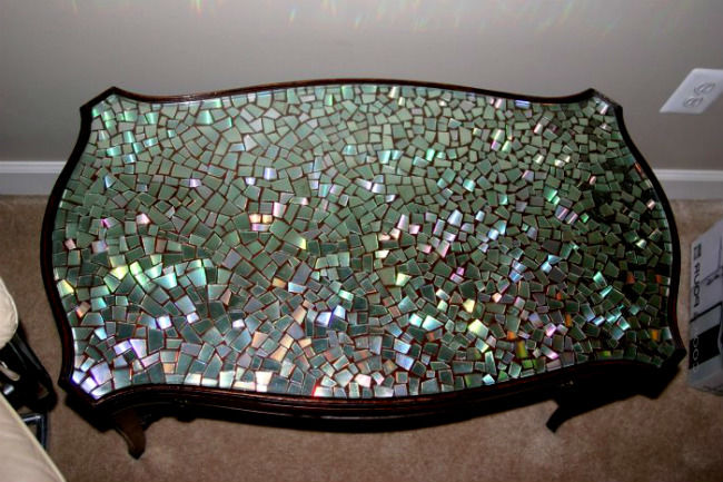 Не е необичайно да имате много компактдискове, натрупани в къщата. Ако не се използват по предназначение, те могат да се използват за декорация на плотове на маси в мозаечен стил.