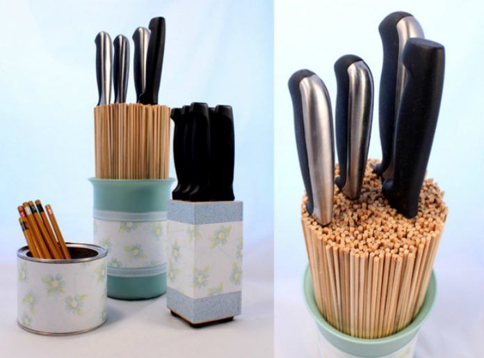 Опасните прибори за рязане трябва да се съхраняват в стелажи, които сами сте изработили. Необходима ви е висока пластмасова чаша или широка ваза. Напълнете подготвения съд с дървени шишчета.