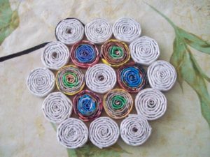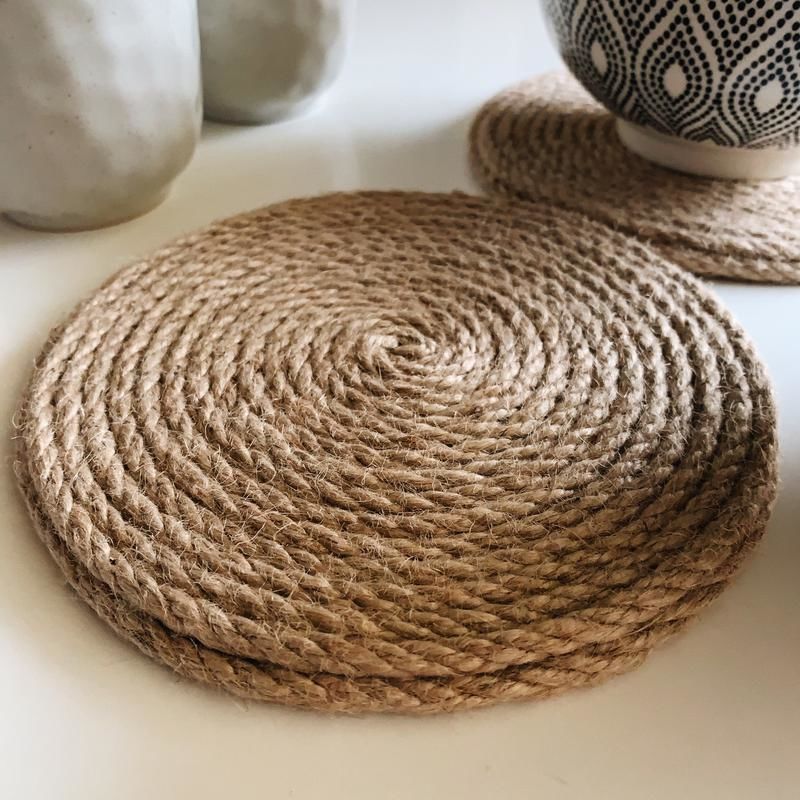 Необходими са кръгло парче дърво, дебел канап и малко лепило. Връвта се усуква от средата във формата на спирала и се залепва за дървена основа.