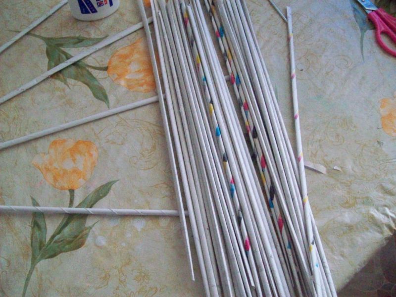 Необходими са игла за плетене, пистолет за лепене и вестник. Навийте вестникарските страници на игла, за да оформите тръбовидни краища.