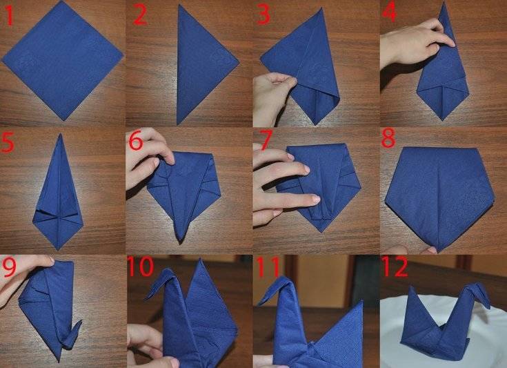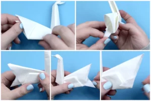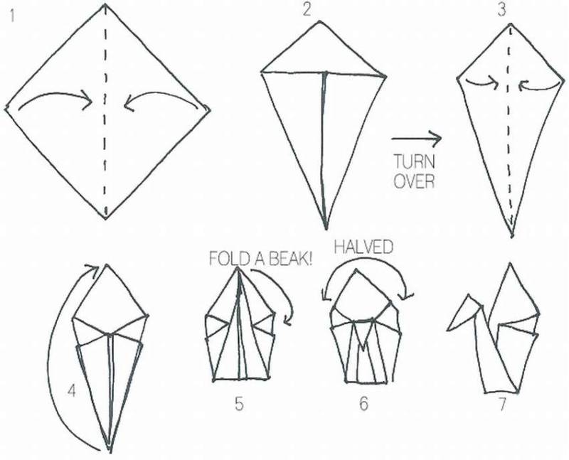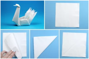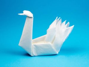 С помощта на такава техника оригами може да се направят лебеди не само от хартия, но и от платнени салфетки, които да украсят празничната маса: