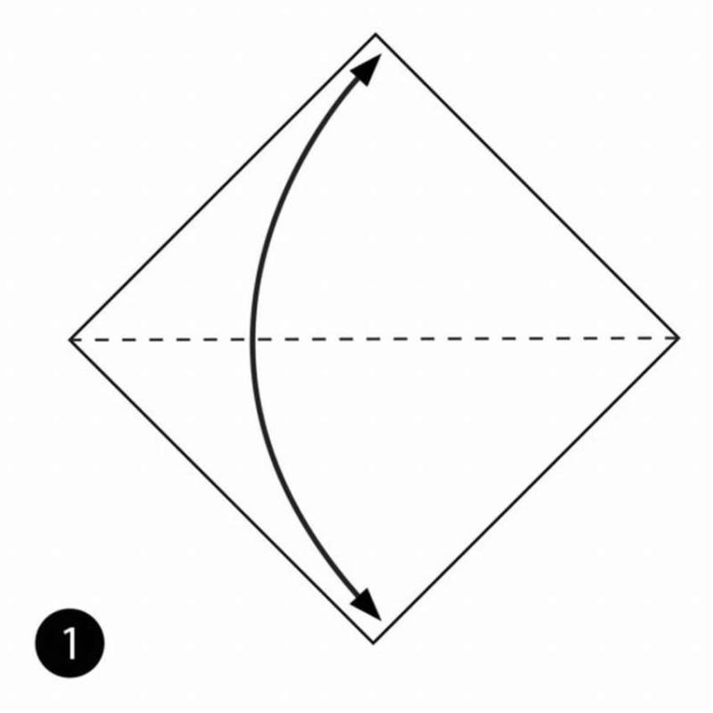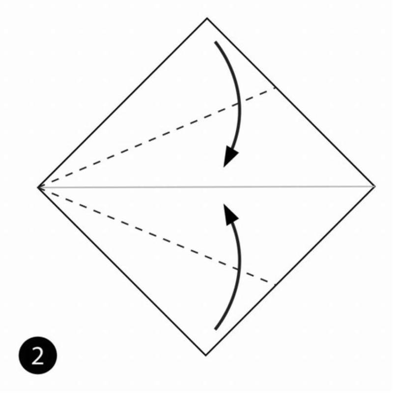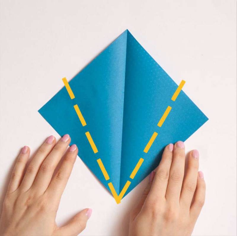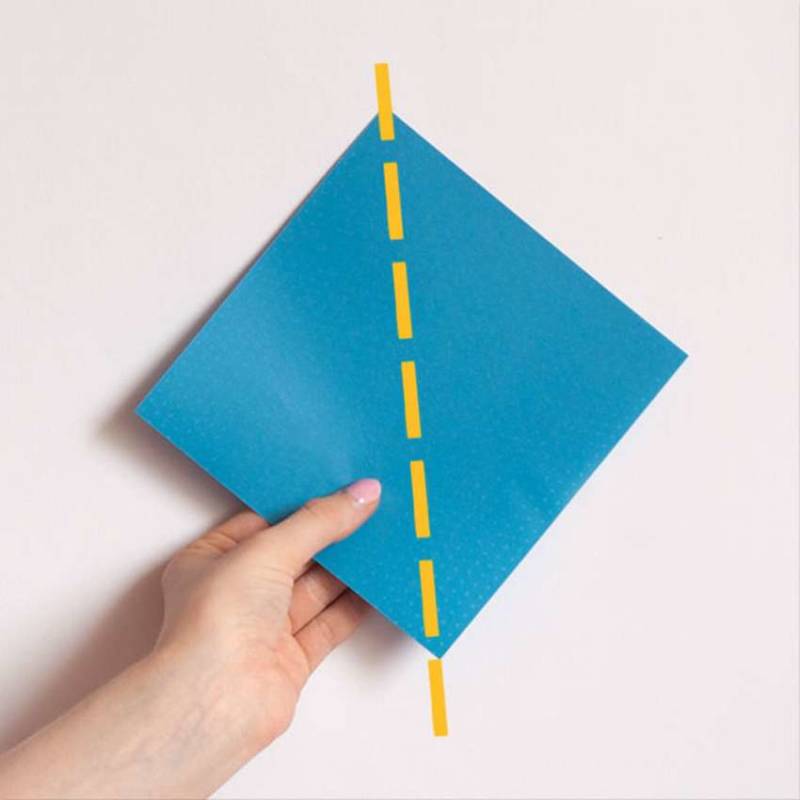 - След това квадратът трябва да се разгъне така, че в средата да има прегъвка. След това двата срещуположни края на квадрата се добавят към гънката. Трябва да получите диамант.