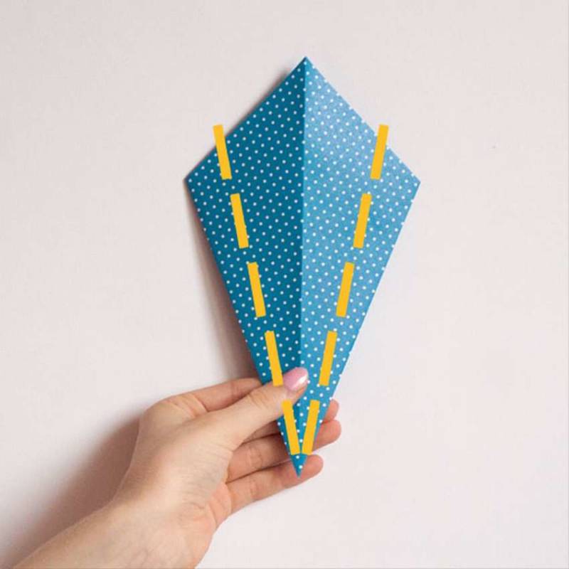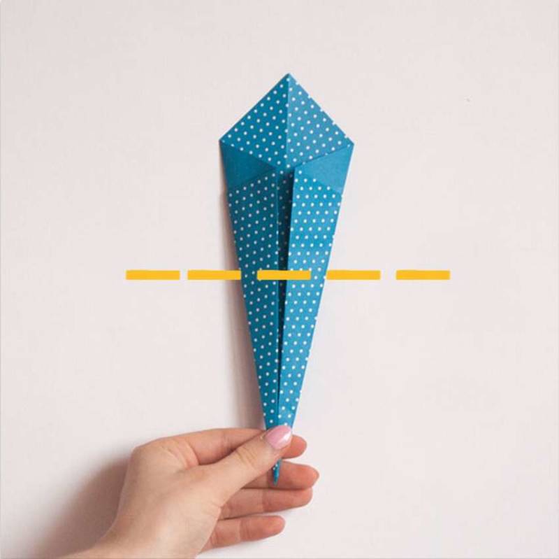 - По пунктирните линии на триъгълника сгънете левия и десния край надолу. "Завесите" трябва да са такива, наклонени надолу.