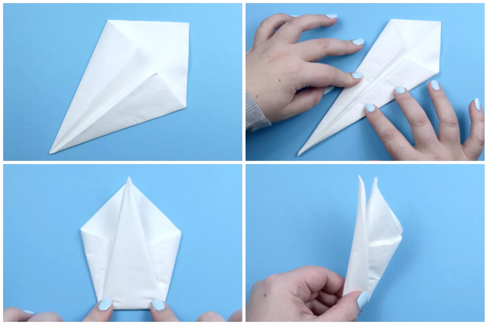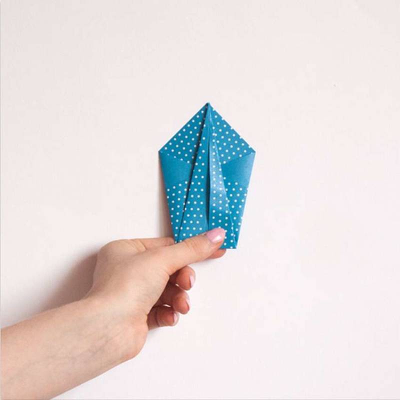 - Долният ъгъл, който се намира под двете съединени страни, трябва да повдигнете нагоре и да огънете по-голямата част от този триъгълник надолу.