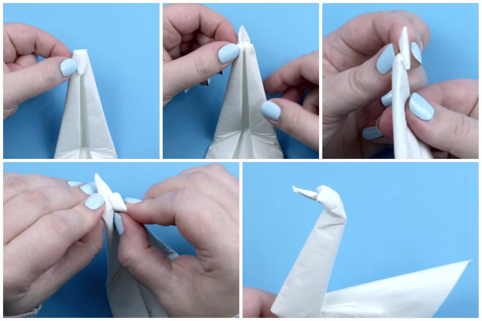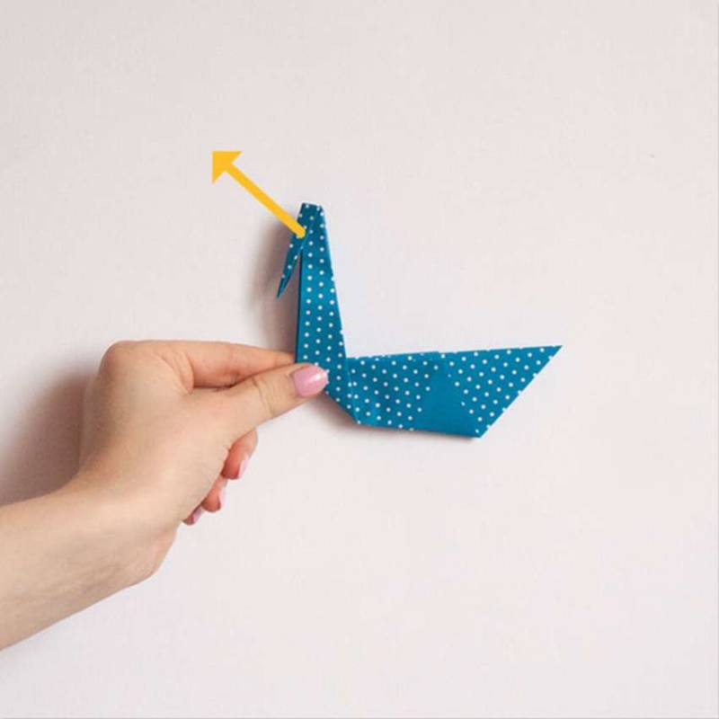 - Последната стъпка ще бъде създаването на главата и човката. Малка част от острия ръб на "шийката" се извива надолу, а след това малка част нагоре. Получавате обемен клюн!