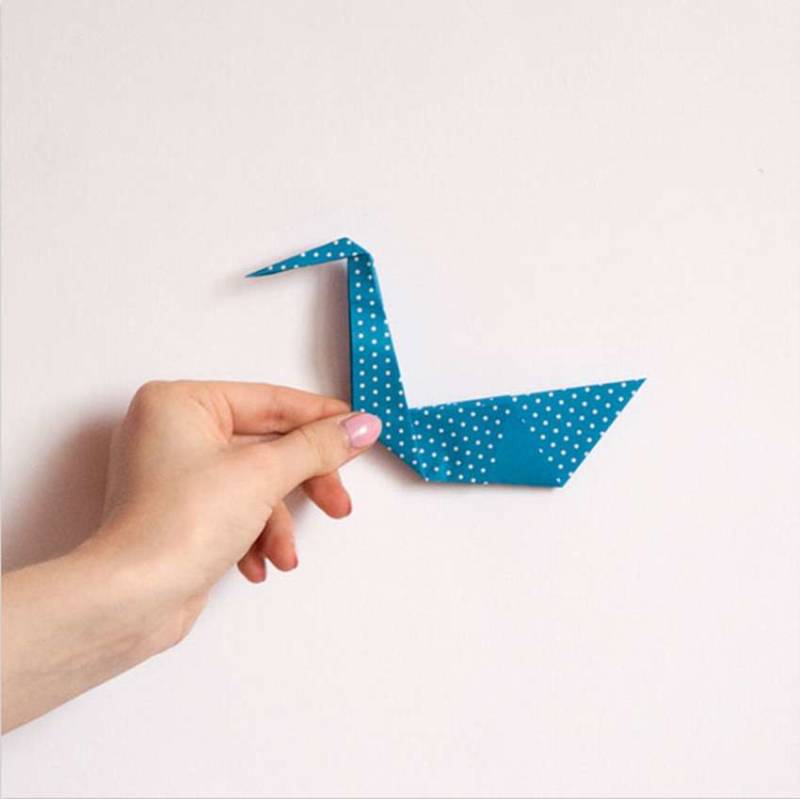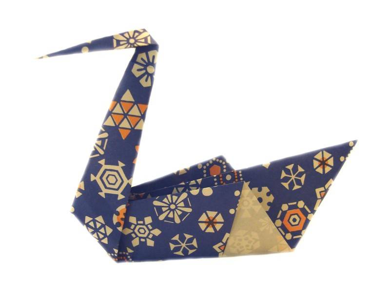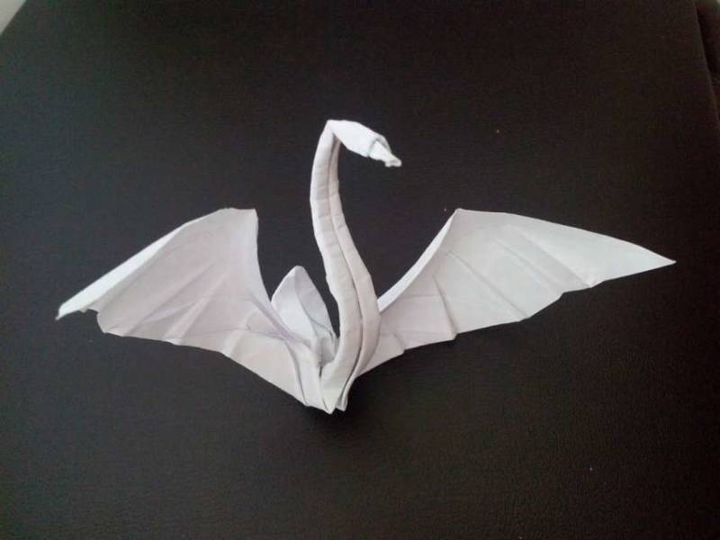 Такъв лебед е по-добре да се направи от голям лист хартия (20 x 20 или 15 x 15 cm), защото с малък размер ще бъде много трудно да се обработят малките елементи.
