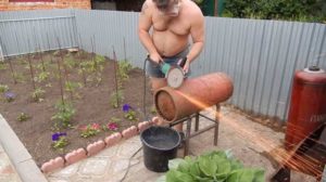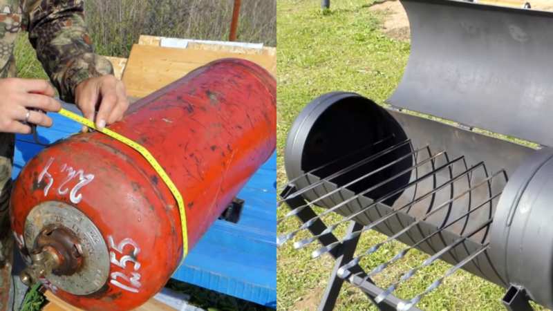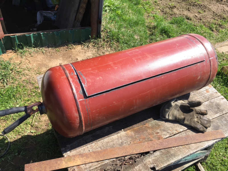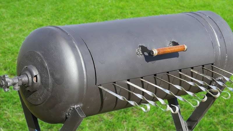 Това е евтин дизайн. Необходима ви е газова бутилка с минимална вместимост 50 литра. Единственото, което трябва да се направи, е да се заварят краката и да се премахне клапанът, който е станал излишен.