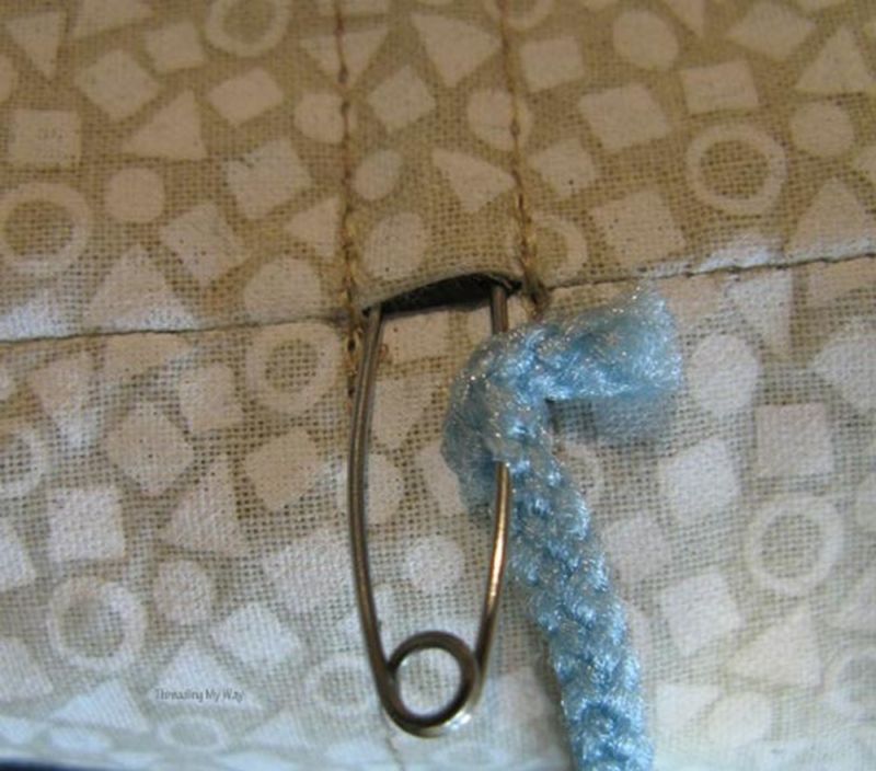 Затягането на връзките в подгъва е много лесно: малка щипка се закрепва за ръба на дантелата и след това се промушва през оставената дупка.