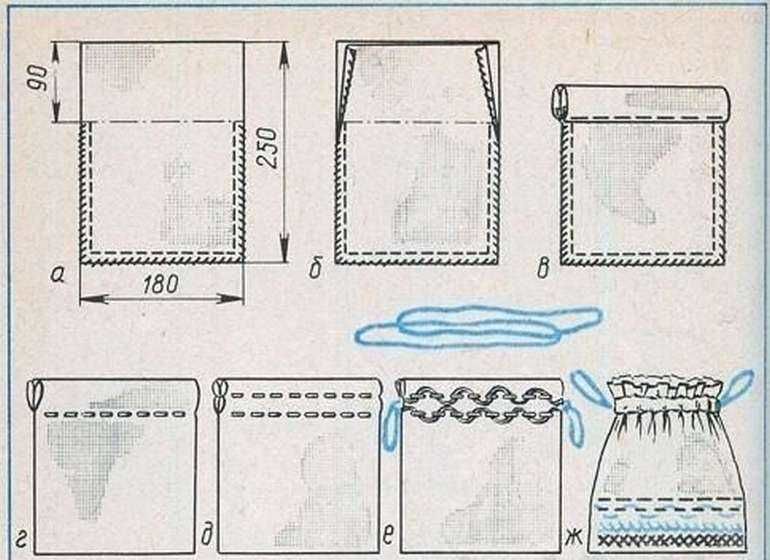 Не е трудно и лесно да ги зашиете или да ги прокарате през специален подгъв. Ако чантата е направена с подплата - за да се издърпат връзките, трябва да се направят два реда, свързващи подплатата и основната част. Между тези два реда дантелата ще бъде прибрана.