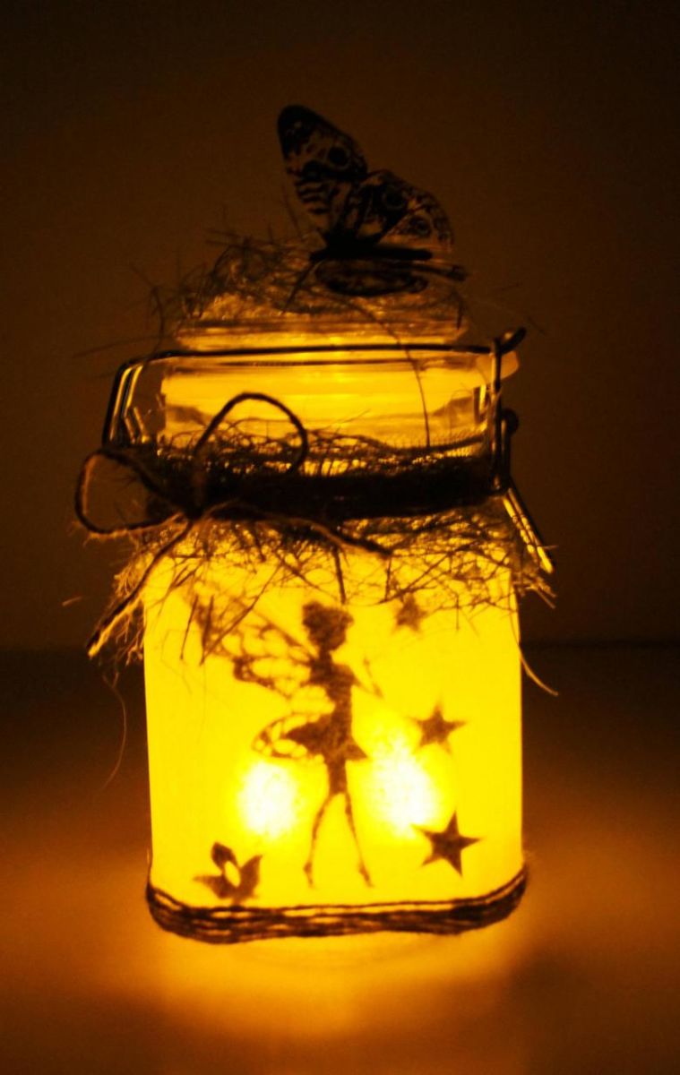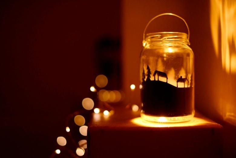- Поставете готовото произведение в буркан и поставете малък фенер или гирлянд в буркана. Затворете капака и работата е свършена!