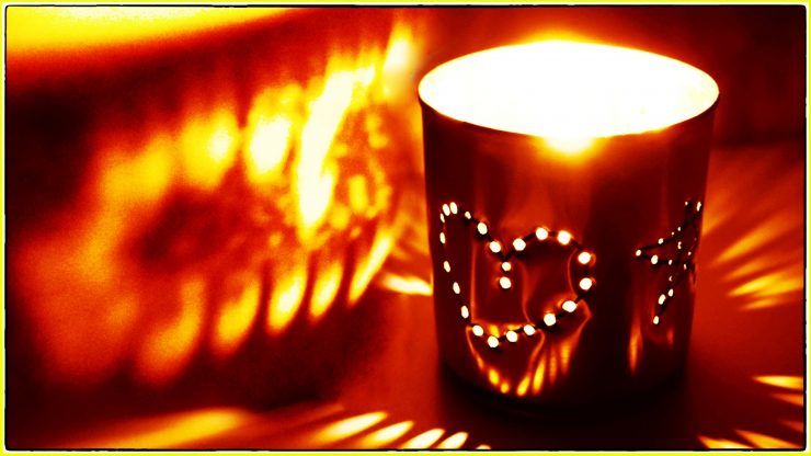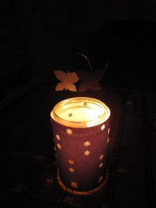 - Поставете свещ, LED лента или друг източник на светлина в чаша и увийте чашата в хартията с готовия орнамент.