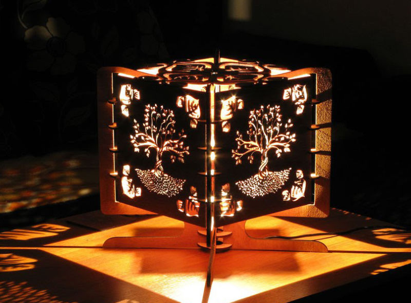Дървените източници на светлина са доста разпространени, тъй като е по-лесно да се произведат от дърво, отколкото от други материали. Дървото дава възможност да се придаде на приспособлението всякаква необичайна форма.