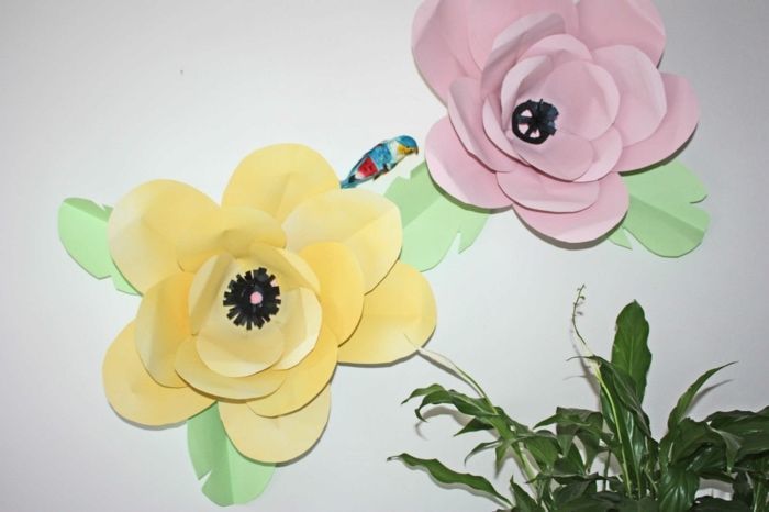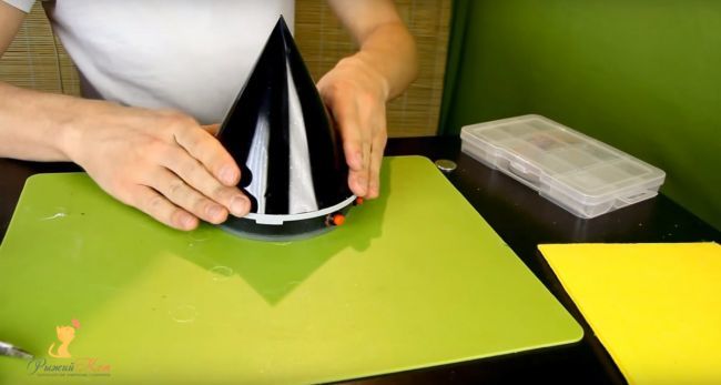С тъмнозелена хартия за пенопласт трябва да се изрежат листа, за да се прикрепят към чашката на цветето. Те са прикрепени към касетата.