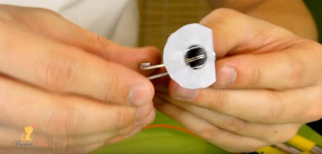 - Направете отвор в абажура, за да се закрепи крушката. Прекарайте дебел конец през отвора.