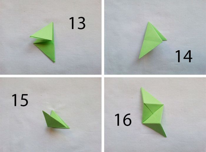 Сгънете зелената, жълтата, червената и синята квадратна хартия на модулни триъгълници: