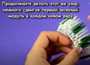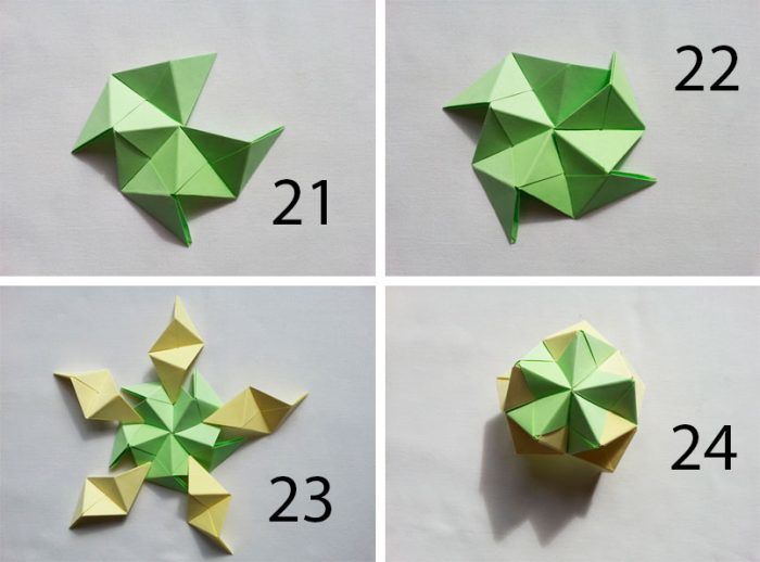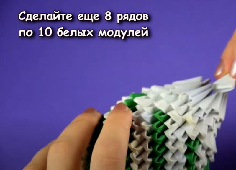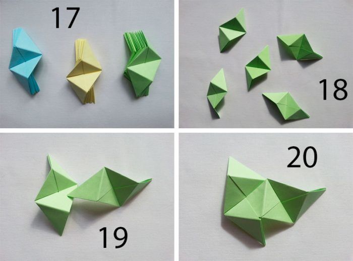 - Всички останали модули с различни цветове ще бъдат поставени между двата модула в средата, така че долната част да се впише във върховете на горните два. Модулите могат да бъдат залепени един за друг за по-голяма здравина.
