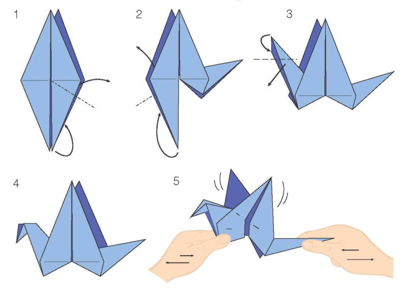 - Сега внимателно огънете ъглите към себе си, обърнете детайла и направете същото, като повторите гънките. Остава само да огънете правилните елементи, като направите опашка на жерав и шия с главата. След това можете да огънете крилата.