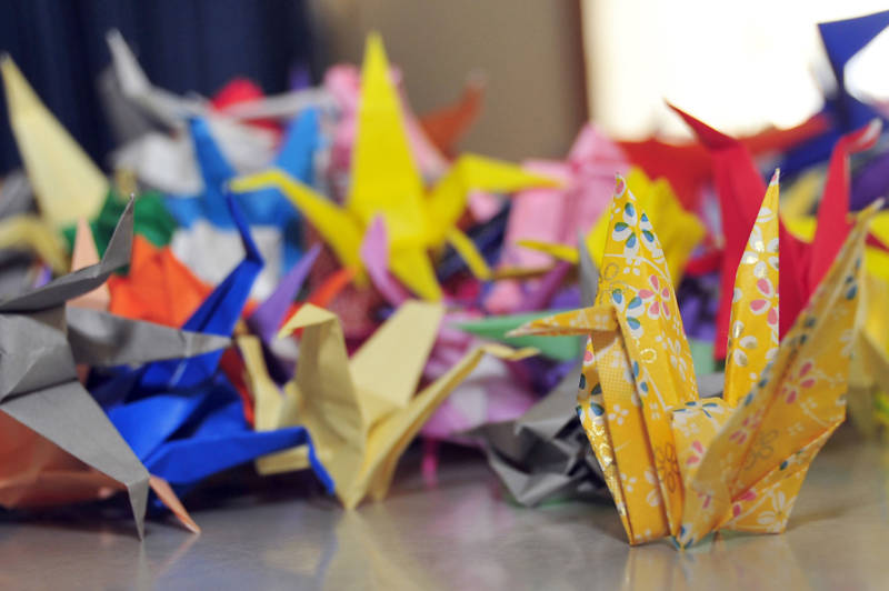 Военновъздушна база Мисава, Япония - Купчина жерави оригами са изложени на маса в началното училище в Солерс на 6 април. В японската култура жеравите са свещени същества. Според легендата всеки, който сгъне хиляда хартиени жерава, ще получи желание от жерав. Крановете ще бъдат изпратени на организацията Students Rebuild, за да помогнат за набирането на средства в подкрепа на японските им връстници. Students Rebuild е глобална организация, която мобилизира младите хора да се свързват, да учат и да предприемат действия по критични въпроси. (Снимка на Военновъздушните сили на САЩ от старши сержант Мари БраунОсвободен)