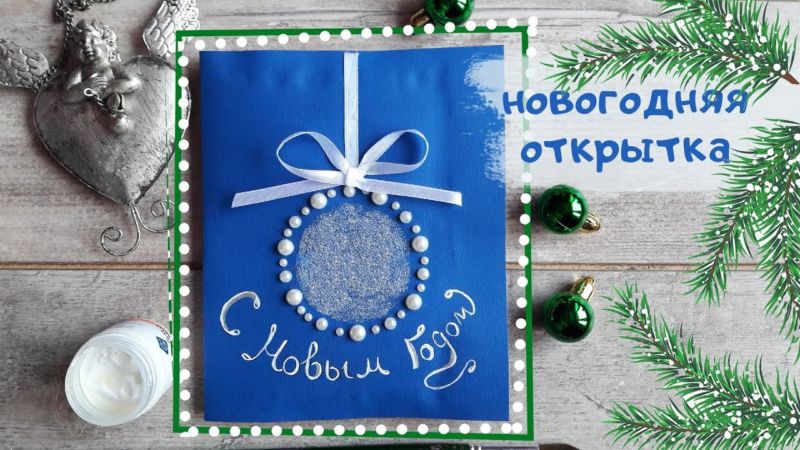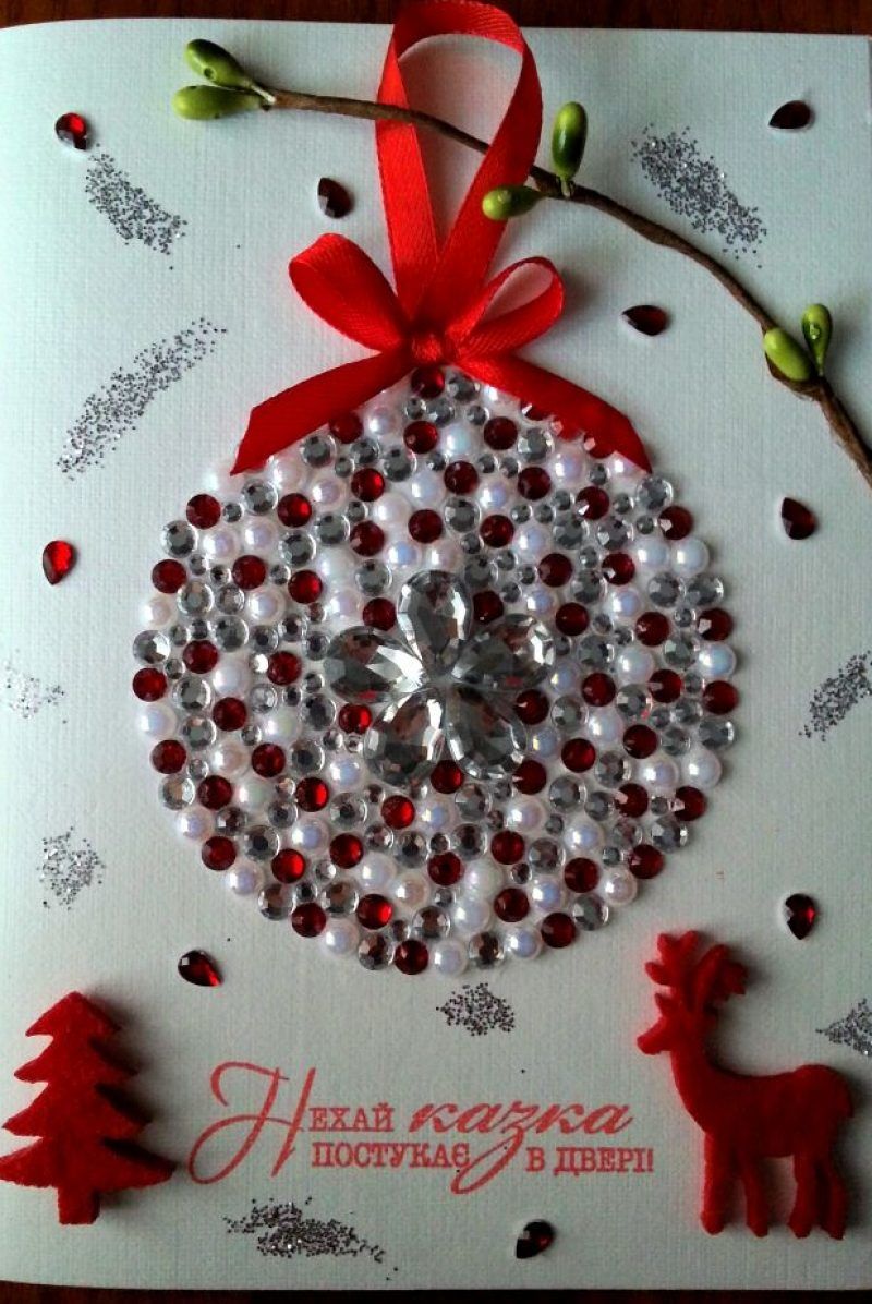 Новогодишната топка може да се направи, като се запълни областта на кръга с червени кристали. В този случай боядисайте кръга в червено или го изрежете от червено листо и го залепете. Останалите стъпки са абсолютно същите като при картичката с половин перла.