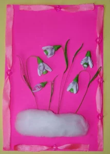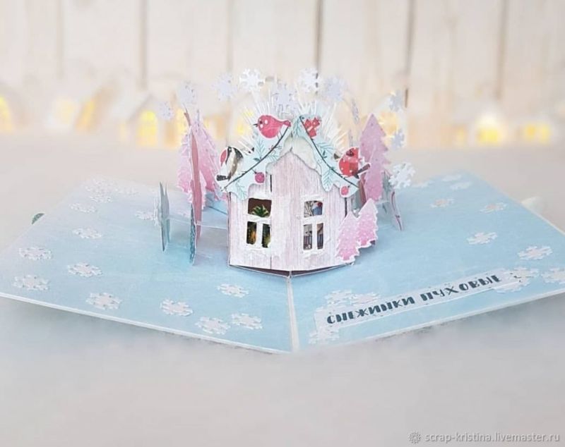 - Внимателно залепете вътрешната част към картонената основа. Не нанасяйте лепило в зоната, където са поставени подрязаните сгъваеми елементи. Тази част не трябва да се залепва към основата. Оставете да изсъхне добре. Можете да сгънете картичката и да я подарите на любимия човек.