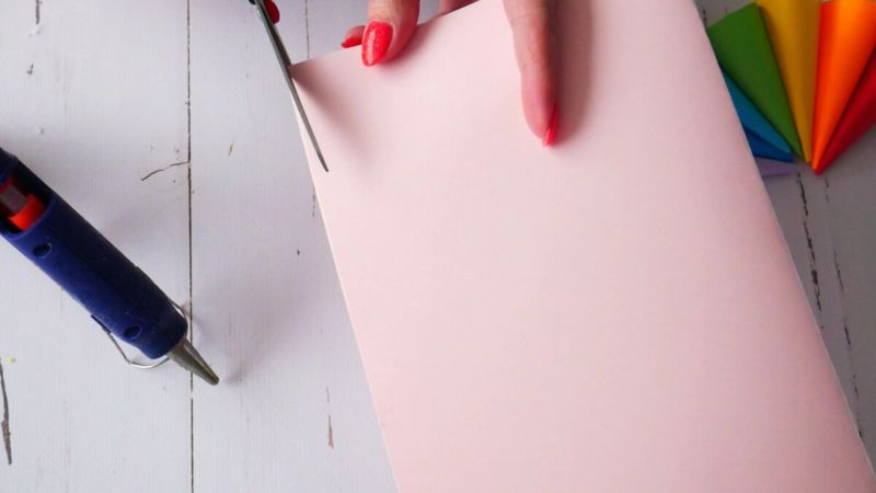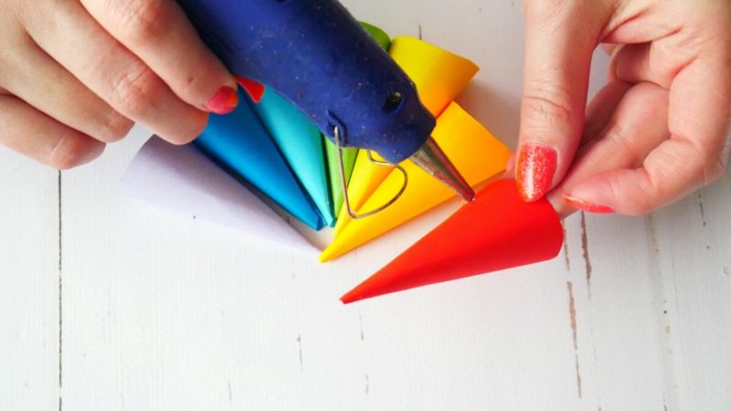 - Залепете лентите по дългата им страна с помощта на лепило, като заличите краищата на 3-4 мм. Следвайте законите за съчетаване на цветовете, като изберете коя лента да залепите след това. Спектърът на дъгата работи добре за ориентация.