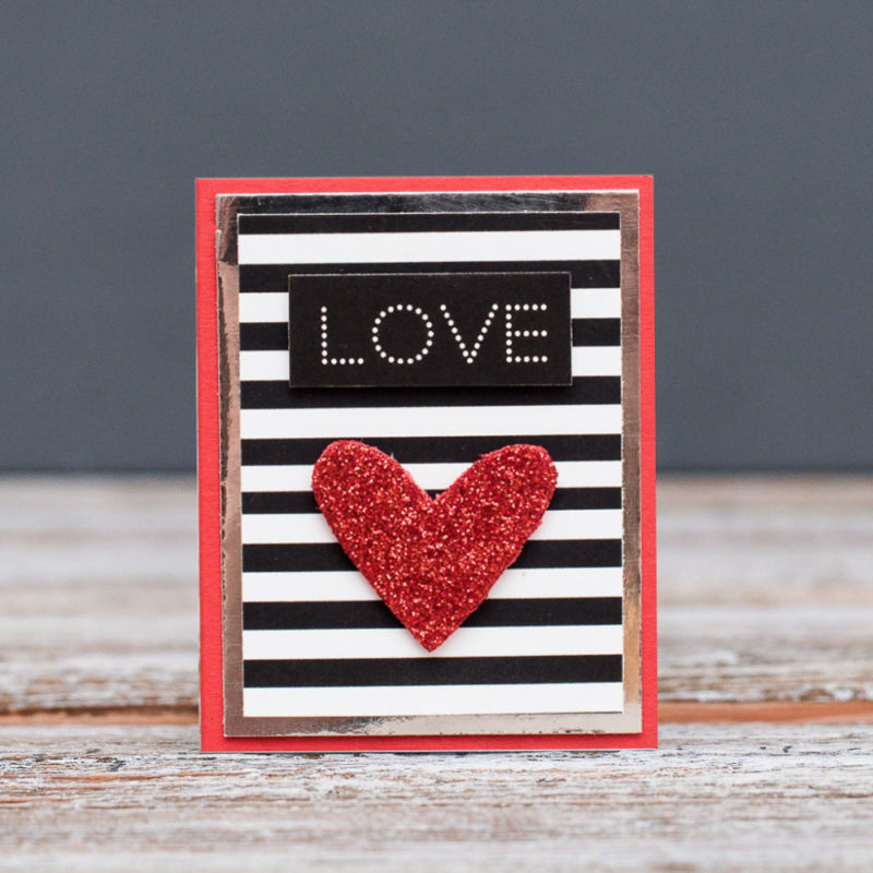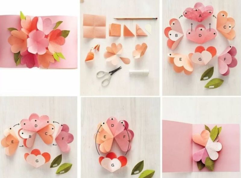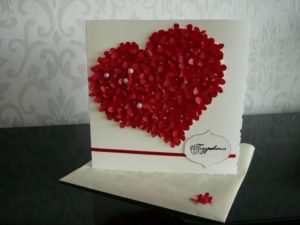 Карта със сърца може да се направи по същия начин. Залепете три сърца, изрязани от кадифена хартия с лурекс, върху красиво парче картон. Издърпайте декоративните конци от сърцата надолу към долния край на картичката, завържете ги на панделка и ги прикрепете в основата с помощта на пистолет за лепене.