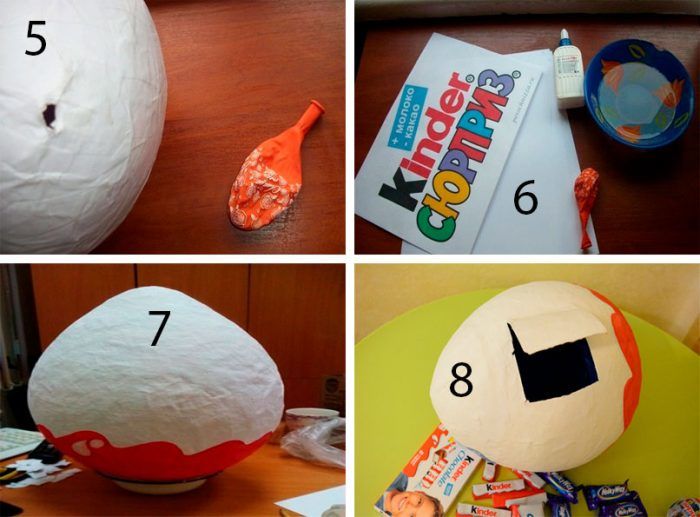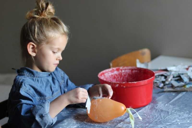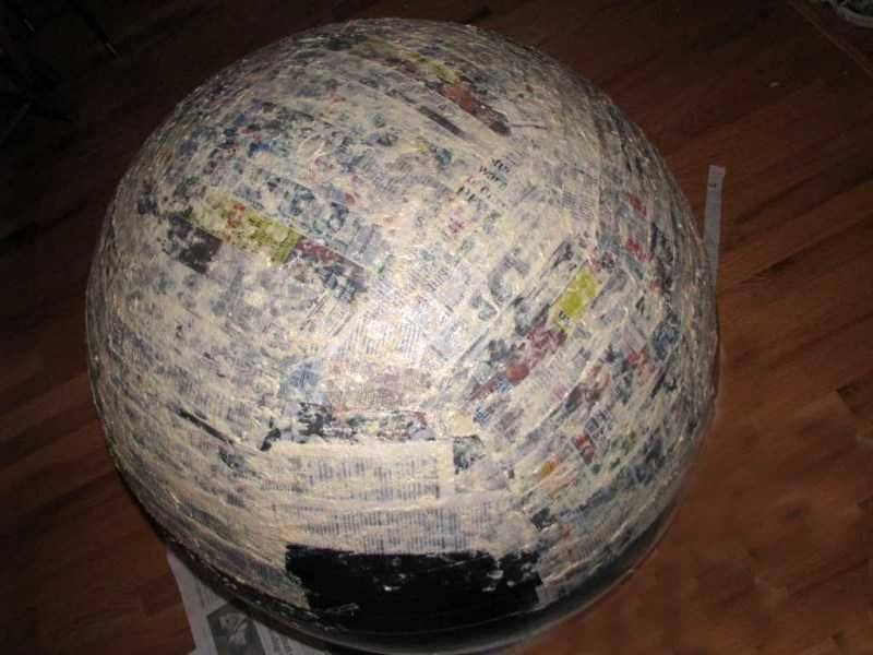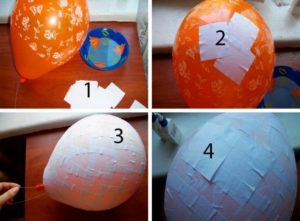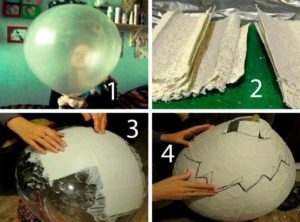 - Към балона се залепват парчета вестник, напоени с вода, и всеки слой вестник се намазва с лепило PVA.