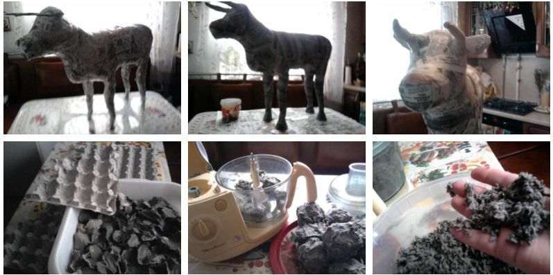 От целулозата от тавичките за яйца могат да се изработят животни, коледни украшения и други малки предмети. Залейте тавите за яйца с гореща вода и ги оставете да се накиснат за един ден. Получената маса се изстисква добре с кърпа и се добавят лепило и PVA лепило.