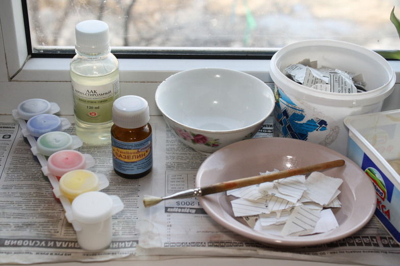 Всички хартиени материали са подходящи за папие-маше: вестници, хартиени кърпи, тоалетна хартия, салфетки, картонени опаковки за яйца. Цялата хартия се къса на ръка или се нарязва на парчета с размери 1,5×1,5 или 2×2 см. За приготвяне на масата за формоване се използват тавички за яйца.
