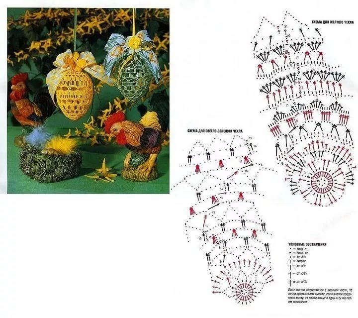 Има много модели на Великденски яйца на една кука, с които можете да се запознаете подробно. Занаятите могат да се плетат не само с прежда, но и с мъниста.