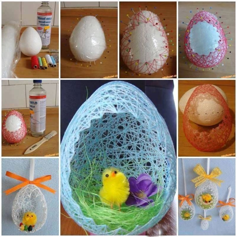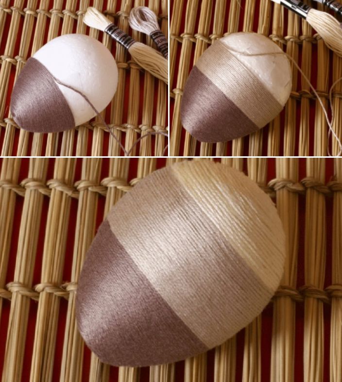 Много интересен начин за украсяване на яйца. Необходими са ви прежда и лепило. Залепете края на преждата към горната част на яйцето. След това постепенно увийте цялото парче около преждата, като фиксирате конеца с лепило. Това е всичко.