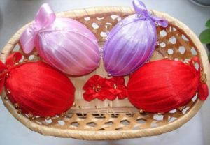 Много често се използва в съчетание с техниката за декориране на кансаши. Най-напред върху яйцето се нанася лепкава материя, след което около него се увиват сатенени ленти, които се разминават леко.