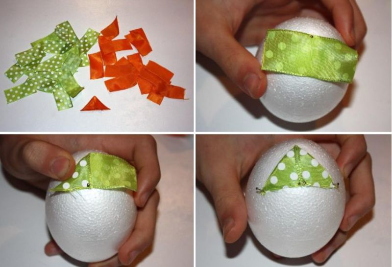 Първата стъпка е да се направи желаната шарка върху заготовката на яйцето с помощта на писалка. След това направете разрези с нож на тези места, изрежете парчета плат, подходящи за модела на великденските яйца, прикрепете ги към повърхността на изделието и вкарайте в разрезите с тънък неостър предмет.